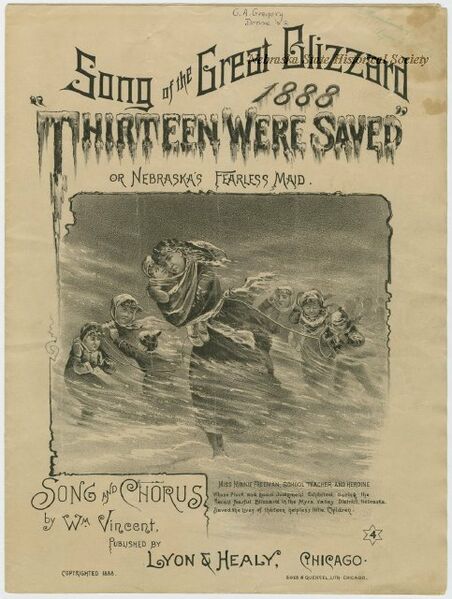 | current | 08:47, 16 January 2018 | 483 × 640 (77 KB) | Joelle (Talk | contribs) | Information = Sheet Music, Thirteen Were Saved; Song, Great Blizzard 1888, Nebr. Minnie Freeman Description = On January 12, 1888, a legendary blizzard across the northern Plains resulted in a great loss of livestock and human life. Minnie Freeman was... |