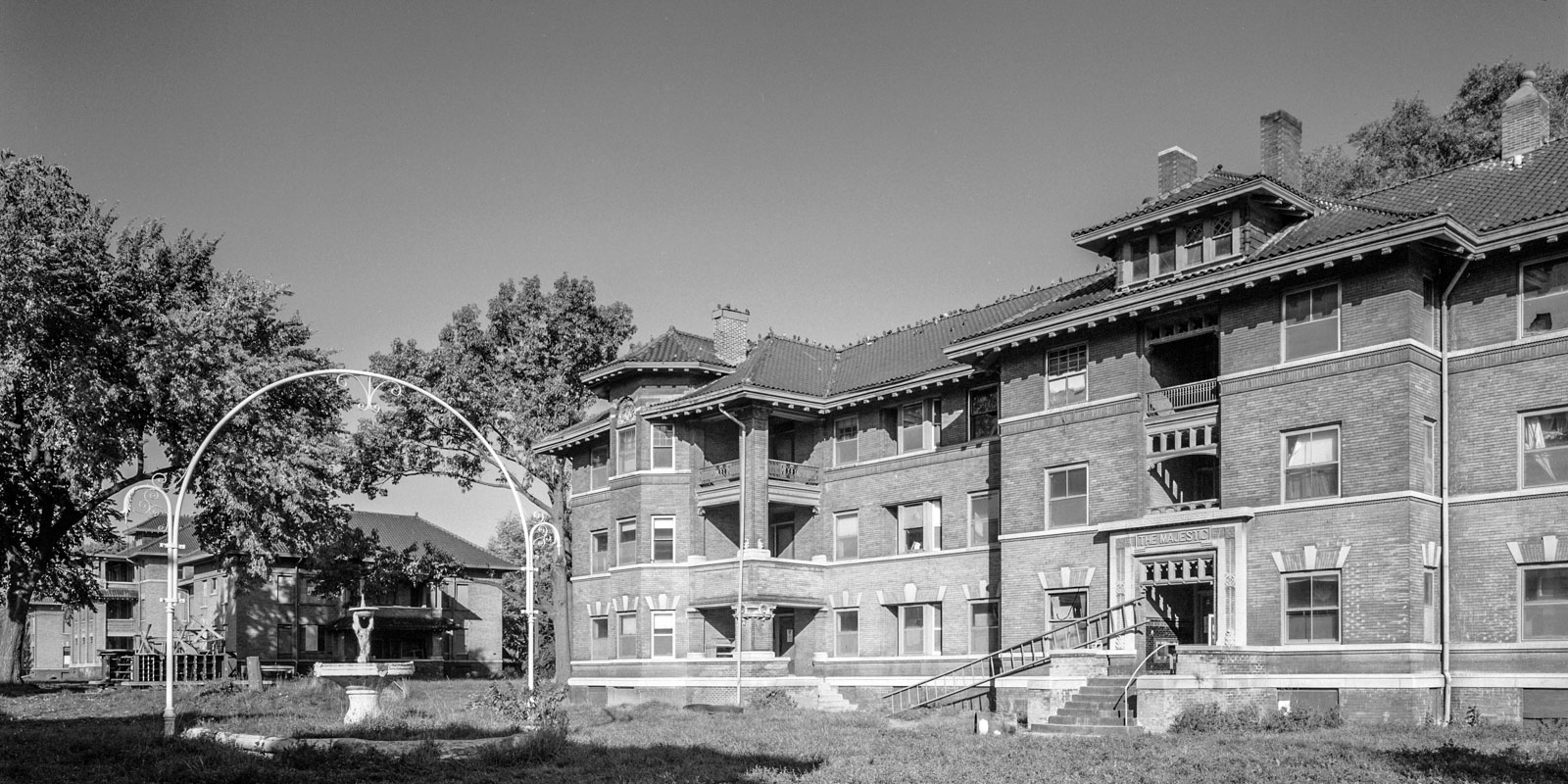Description: Majestic Apartments (1905-1906) part of Strehlow Terrace Garden Apartments (1905-1916), 2024-2107 North 16th Street, Omaha, Nebraska. Frederick A. Henninger (1865-1944), Architect. Photo, 1985.