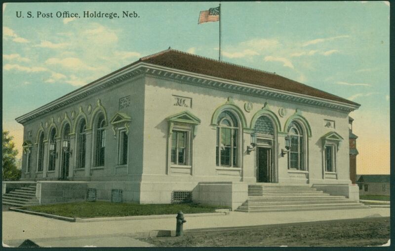 Heading: "U. S. Post Office Holdrege, Neb." Description: Colored postcard, perspective view of Holdrege U. S. Post Office, James K. Taylor, Supervising Architect of the Treasury Date: c. 1911 Source: Nebraska State Historical Society, RG2389 (Phelps County, Neb.) 30639 Rights Usage Terms: Public, non-commercial use, with credit, is granted file names ending in ‘w’ no derivatives.
