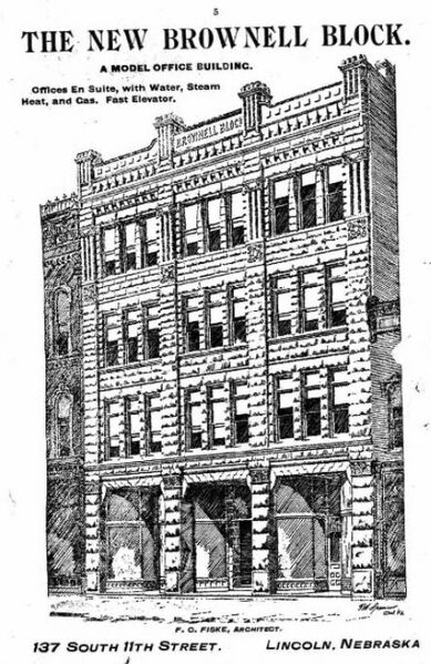 Description: Advertisement in Lincoln City Directory of 1893 for "The New Brownell Block," a.k.a. "Latta Building," designed 1892 by F. C. Fiske, drawing by F. W. Spencer.