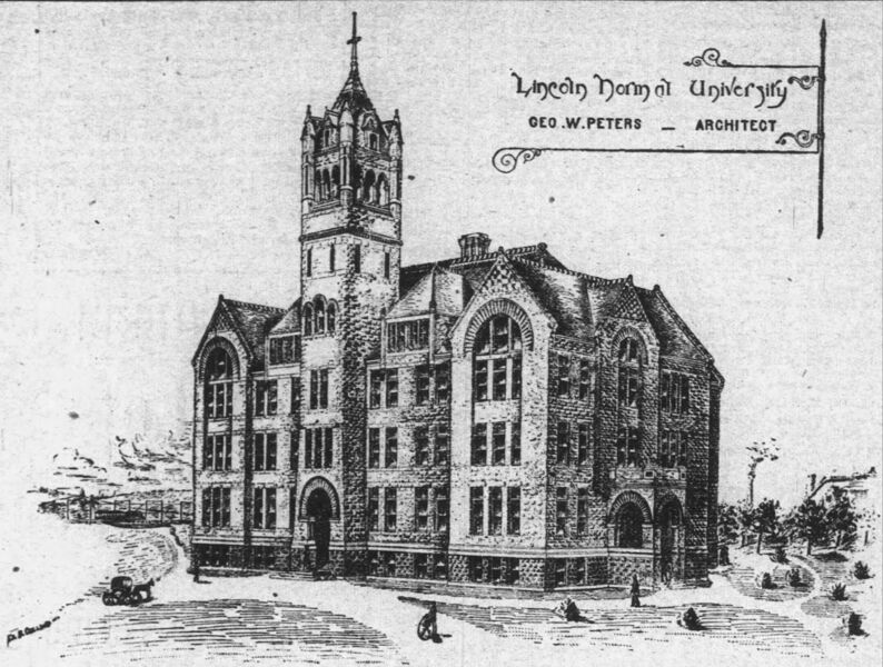 Heading: Lincoln Normal University. Description: Rendering for Lincoln Normal University, signed Geo. W. Peters, architect Date: 1890 Source: Lincoln (Nebraska) Evening News (October 30, 1890), 1. Rights Usage Terms: Public, non-commercial use, with credit, is granted file names ending in ‘w’ no derivatives.