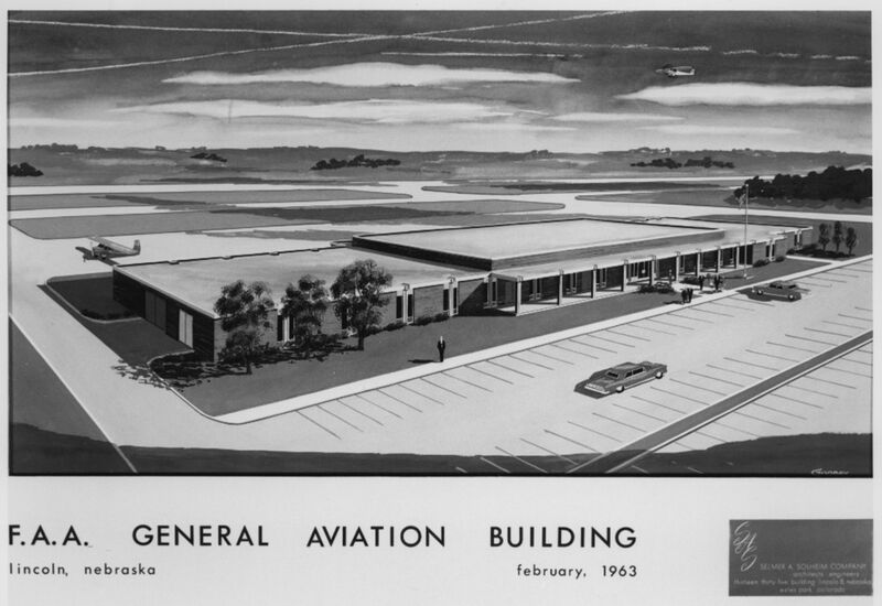 Heading: Lincoln Municipal Airport General Aviation Building. Description: Aerial perspective for "F.A.A. General Aviation Building" at Lincoln, Nebraska, designed by Lincoln architect Selmer Solheim Date: February 1953 Credit: Selmer A. Solheim Company Source: Nebraska State Historical Society, RG2158 Lincoln (Neb.) Collection, Scan #43995 Rights Usage Terms: Public, non-commercial use, with credit, is granted file names ending in ‘w’ no derivatives.
