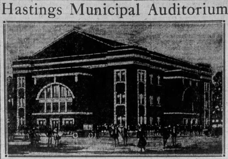Heading: Hastings Municipal Auditorium. Description: Preliminary rendering for Hastings Auditorium by C. W. Way Co. Date: 1922 Credit: C. W. Way Co. Source: (Lincoln) Nebraska State Journal (June 20, 1922), 7. Rights Usage Terms: Public, non-commercial use, with credit, is granted file names ending in ‘w’ no derivatives.