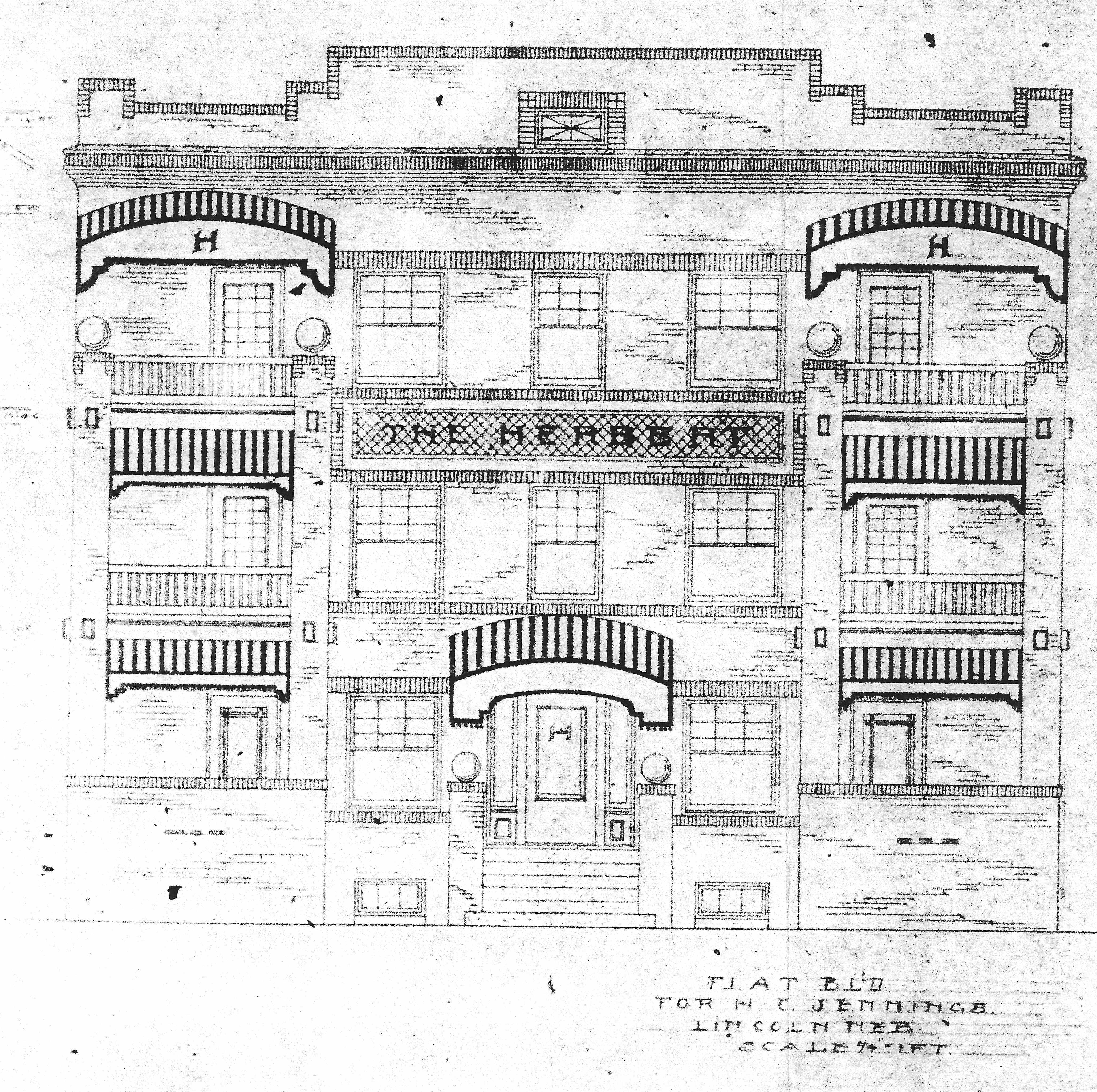 Heading: "Flat Bl'd for H. C. Jennings. Lincoln Neb." Description: Elevation drawing by Edwin G. Ward for "The Herbert" flats, built at 712 S. 11th Street, Lincoln, Nebraska as "Lorraine Apartments." Date: 1914 Credit: E. G. Ward Source: City of Lincoln Building & Safety Department, application materials for Building Permit 5361 Rights Usage Terms: Public, non-commercial use, with credit, is granted file names ending in ‘w’ no derivatives