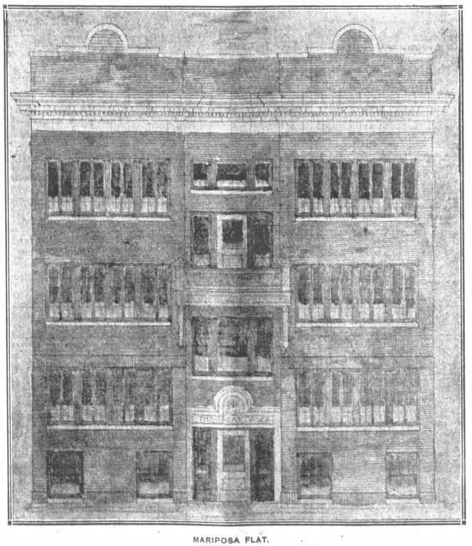 Heading: "Mariposa Flat." Description: East elevation for Mariposa apartments, 745 South 11th St., Lincoln, Nebraska, C. H. Larsen, architect' Date: 1915 Source: Nebraska State Journal (Lincoln, Nebraska) (July 25, 1915), 8. Rights Usage Terms: Public, non-commercial use, with credit, is granted file names ending in ‘w’ no derivatives.