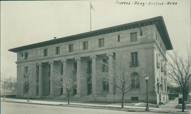 Heading: Federal Bldg McCook Nebr. Description: Black & white photograph of U. S. Courthouse & Post Office, McCook, Nebraska, designed by Supervising Architect of the Treasury Oscar Wenderoth Date: c. 1915-1920 Source: Nebraska State Historical Society, RG2442 Red Willow County 30934 Rights Usage Terms: Public, non-commercial use, with credit, is granted file names ending in ‘w’ no derivatives.
