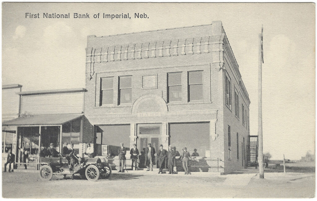 Heading: First National Bank of Imperial, Neb. Description: View of First National Bank of Imperial, Nebraska, John McDonald of Omaha, architect Source: Matt Hansen Postcard Collection. Rights Usage Terms: Public, non-commercial use, with credit, is granted file names ending in ‘w’ no derivatives.