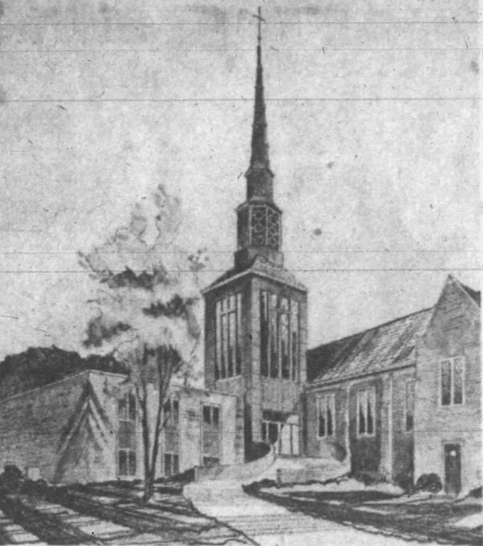 Heading: Bethel Evangelical & Reformed Church, Nebraska City, Nebraska. Description: Rendering for new Bethel Evangelical & Reformed Church, Nebr. City, NE, by architects Fritz Craig & Jack Beers. Date: 1957. Credit: probably Fritz Craig. Source: Lincoln (Nebraska) Sunday Journal & Star (September 1, 1957), 5-D Rights Usage Terms: Public, non-commercial use, with credit, is granted file names ending in ‘w’ no derivatives.
