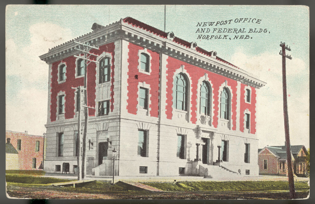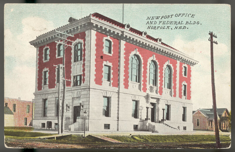 Heading: "New Post Office and Federal Bldg, Norfolk, Neb." Description: Colored postcard view of U. S. government building, Norfolk, Nebraska, James K. Taylor, Supervising Architect of the Treasury Date: c. 1906 Source: Nebraska State Historical Society, RG2186.PH Madison County (Neb) 28700 Rights Usage Terms: Public, non-commercial use, with credit, is granted file names ending in ‘w’ no derivatives.