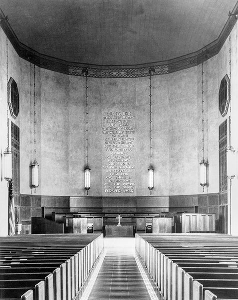 Interior view of the original sanctuary, looking north. The Lord's Prayer is in gold leaf on the back wall of the apse.The altar end has been substantially remodeled with the addition of a large organ.