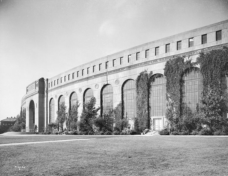 Description: Memorial Stadium, 1921-1923, University of Nebraska, Lincoln, Nebraska. Davis & Wilson and John Latenser & Sons, joint architects. East facade looking to the southwest. Photograph, September 20, 1935.