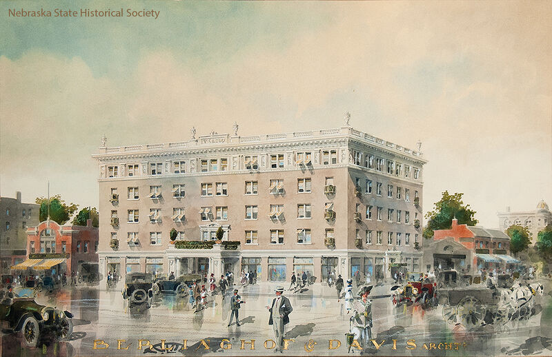 Description = Copy of watercolor rendering by Francis W. Fitzpatrick, artist, for Berlinghof & Davis, Architects; competition proposal for new McCloud Hotel, York, Nebraska, caa. 1916