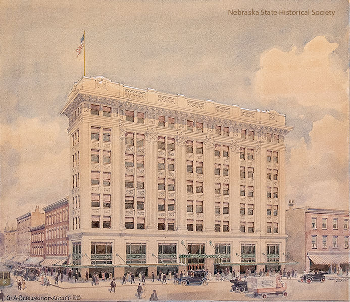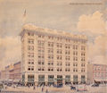 Description: Watercolor rendering by George A. Berlinghof for George A. Berlinghof (1858-1944), Architect; proposal for a highrise building, 13th & O Sts., Lincoln, Nebraska, 1918.