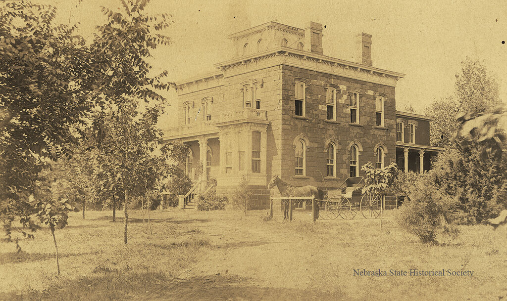 Description = Governor David Butler House (1869). "Residence of Hon. David Butler, 1st Gov. of Nebraska; Erection 1870; Residence of F. W. Hohmann 1882-1894. Photo given by F. W. Hohmann Febr. 14, 1939, from the collection of his brother, C. H. Hohmann." John Keys Winchell (1841-1877), Architect [D. Murphy]. Albumen photo ca. 1880-1885 [John E. Carter] The photograph was taken before the Frear Stone veneer and window hoods were removed and replaced with brick veneer. This image has been rotated and cropped from the original for presentation purposes.