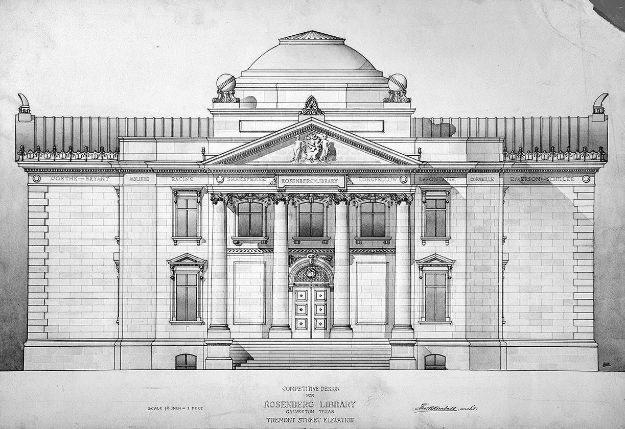 Description: Rosenberg Library (1901), Galveston, Texas. Thomas Rogers Kimball (1862-1934), Architect. Job 355, 1901, competition drawing by "HAR"; ink and ink wash on paper. Note: "HAR" is probably Henry A. Raapke (1876-1959), Architect, who started working for Kimball in 1902. By background and training, Raapke would certainly have been capable of making this drawing.