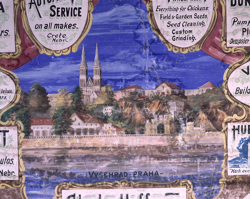 Description: Advertising curtain (1932), Wilber Opera House, Wilber, Nebraska. Byrl J. (Jack) Ballard (1878-1952), Scenery & Fresco Painter.