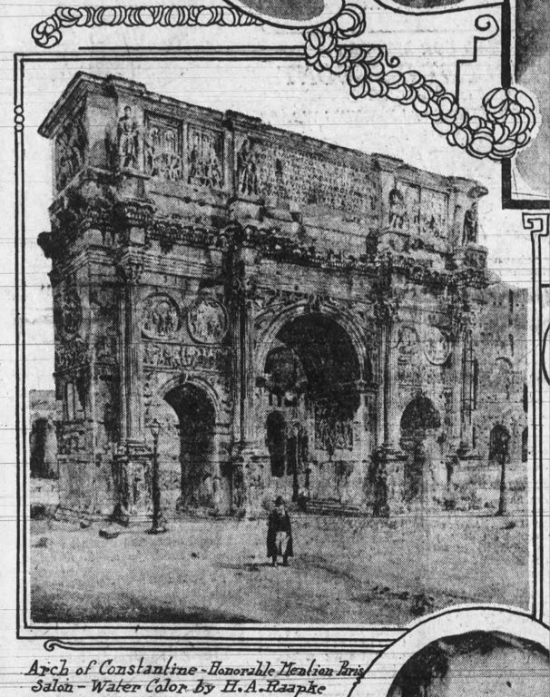 Heading: "Arch of Constantine," watercolor by H. A. Raapke. Description: Watercolor rendering by H. A. Raapke of "Arch of Constantine," Rome Date: ca. 1906 Source: Omaha (Nebraska) Sunday Bee (November 3, 1912), 13. Rights Usage Terms: Public, non-commercial use, with credit, is granted file names ending in ‘w’ no derivatives.