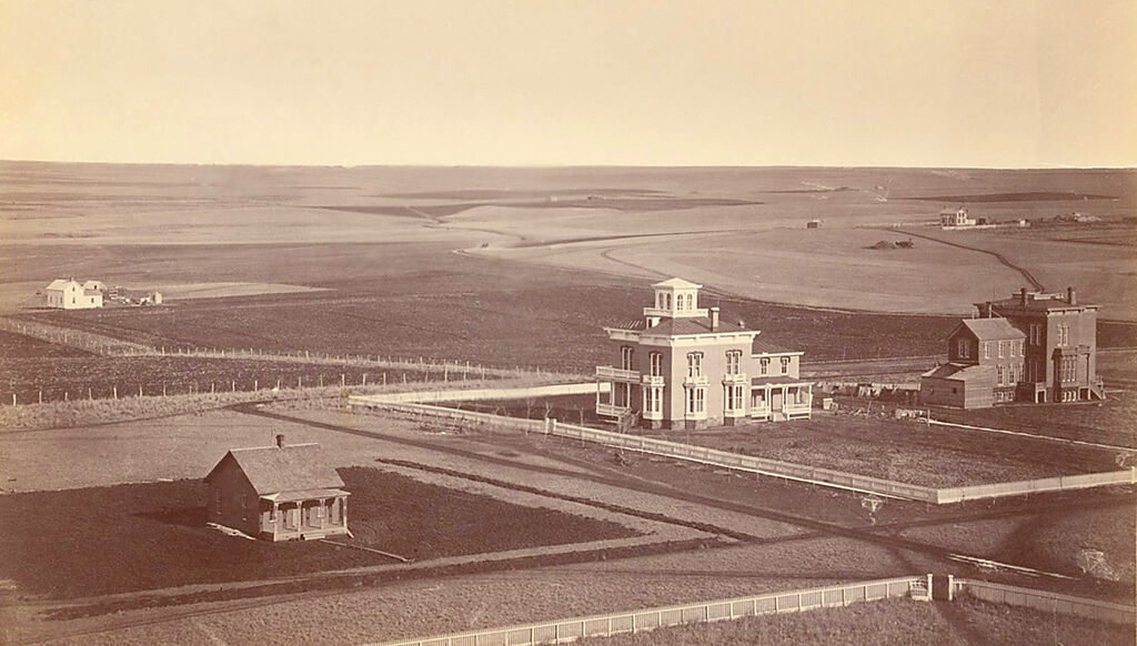 Information = Capitol Commissioners Thomas P. Kennard and John Gillespie houses (at right), Lincoln, Nebraska, 1871; view from the first state capitol, looking southeast. Houses designed in 1868 by John Keys Winchell (1841-1877), Architect, Chicago, Illinois