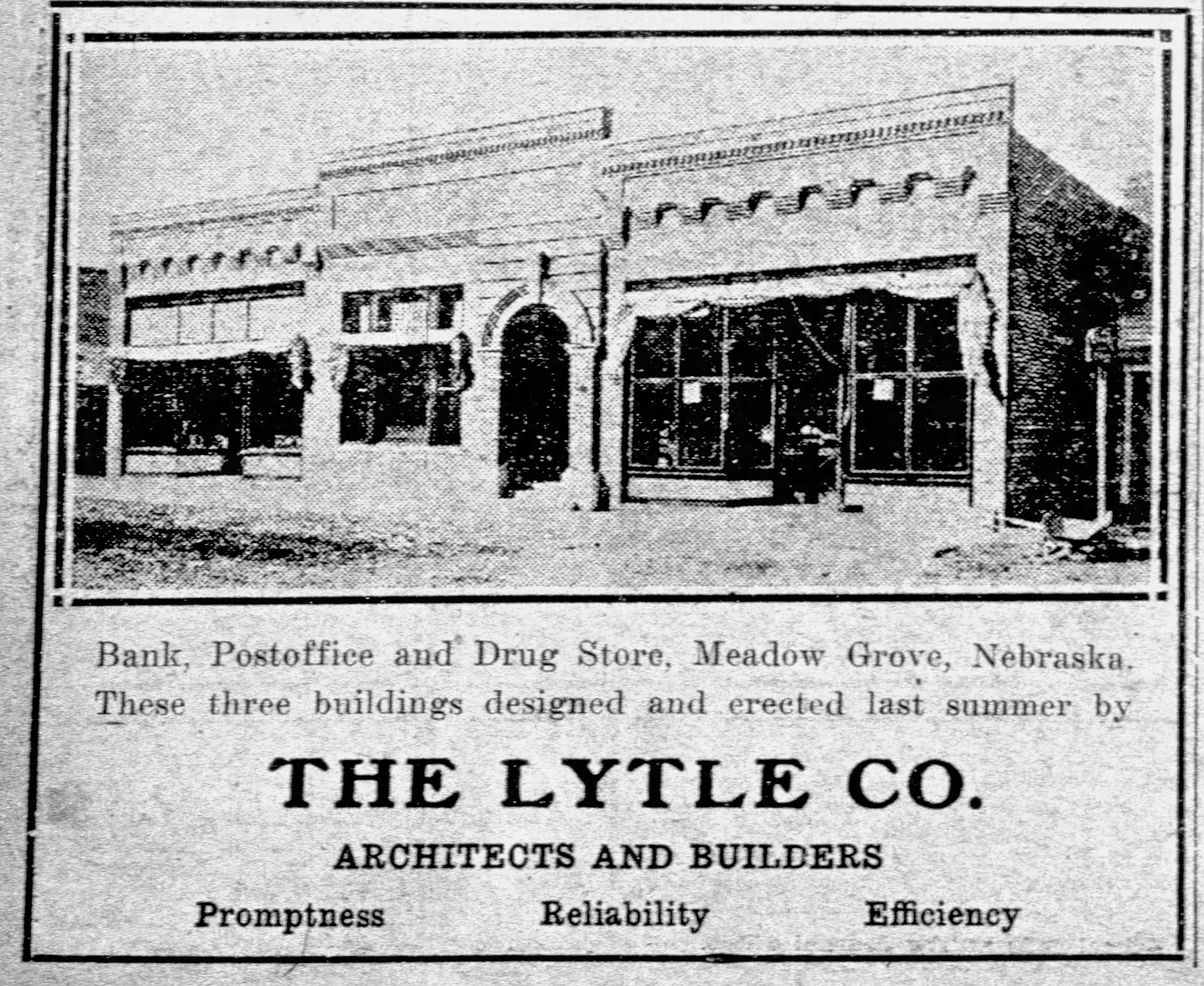 Heading: Advertisement for "The Lytle Co.," 1911.. Description: Newspaper advertisement for The Lytle Company, featuring the 1910 commercial block in Meadow Grove, Nebraska. Source: Sioux City (Iowa) Journal (April 9, 1911), 10. Rights Usage Terms: Public, non-commercial use, with credit, is granted file names ending in ‘w’ no derivatives.
