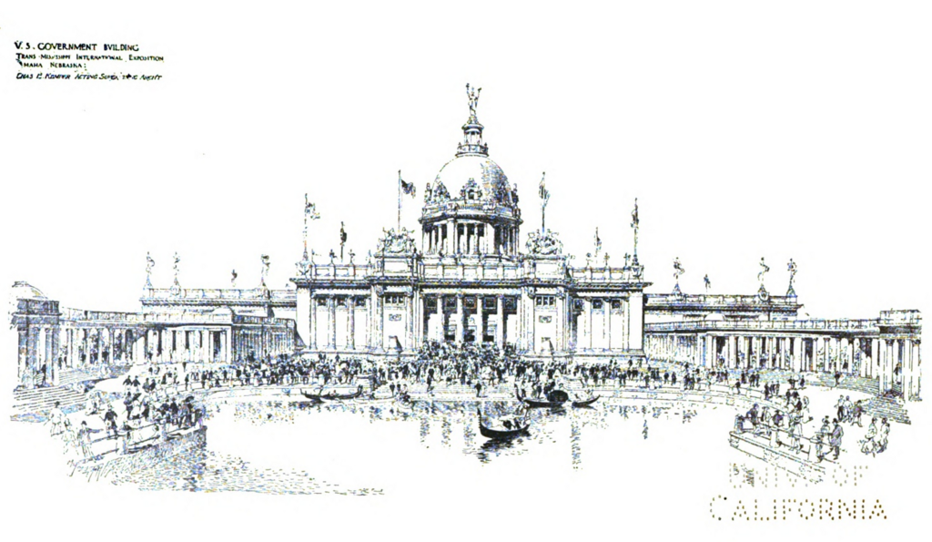 Heading: U. S. Government Building Trans-Mississippi International Exposition. Omaha, Nebraska. Description: Rendering of the U. S. Government Building on the central lagoon, Omaha's Trans-Mississippi Exposition, as designed by Charles E. Kemper Date: 1897 Credit: Edward A. Crane, draughtsman Source: James Knox Taylor, Annual Report of the Supervising Architect to the Secretary of the Treasury for the Year Ending September 30, 1898 (Washington, D.C.: Government Printing Office, 1898), 36-37. Rights Usage Terms: Public, non-commercial use, with credit, is granted file names ending in ‘w’ no derivatives.