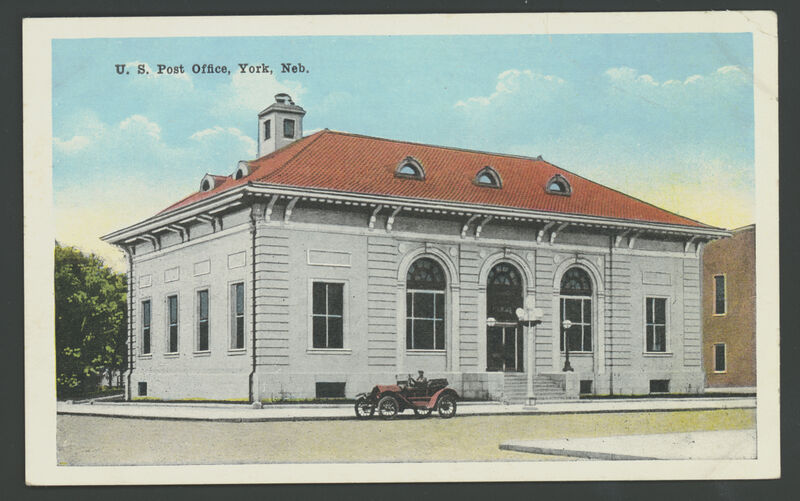Heading: "U. S. Post Office, York, Neb." Description: Colored postcard view of U.S. Post Office, York, Nebraska, James K. Taylor, Supervising Architect of the Treasury Date: c. 1920s Source: Nebraska State Historical Society, RG2856 (York County, Nebr.) 100407 Rights Usage Terms: Public, non-commercial use, with credit, is granted file names ending in ‘w’ no derivatives.