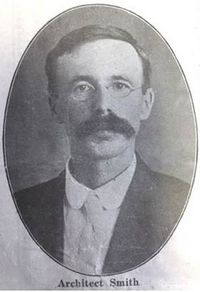 John R. Smith was born May 4, 1870 in Wisconsin to Richard H. and Mary Smith. The U. S. Census listed his father as a lead miner in 1870 and as a farmer in 1880. The family moved in the 1880s to Pierce County, Nebraska, where John married Florence Watson on December 31, 1899.[1] John was identified as a farmer in Willow Creek, Pierce County, Nebraska in the 1900 census. Florence and John had three children, the last a daughter born in 1905, the year her mother Florence died and was interred in Pierce County. 1905 was also the first year John R. Smith was listed in a Lincoln, Nebraska city directory as a draftsman for architect J. H. Craddock. Smith was a draftsman for a Lincoln millwork company in 1906 and 1907, then in 1908 was a draftsman for F. C. Fiske in the Lincoln office of Fiske & Dieman. He married Rose Inez (nee Wilson) Sheetz in 1908 and in 1909 began to be listed as an architect in University Place (now Lincoln), Nebraska.[9][a] While he continued to reside in University Place for many years, his office was in downtown Lincoln as early as 1911. He designed residences, several schools and other public buildings in University Place and elsewhere in Nebraska, and made a specialty of church design, publishing a brochure "Modern Church Architecture" that listed 100 churches in five Midwestern states "for which we have furnished architectural services." His son Rolland practiced with him as John R. Smith & Son from 1921-1934.[10] John Smith was a WPA administrator in Lincoln in the late 1930s, but was no longer listed in Lincoln city directories after the early 1940s. He died in Denver February 11, 1958, and was interred at Wyuka Cemetery in Lincoln.[19]