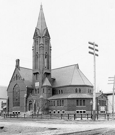 First Presbyterian Church (1884-1885), SW corner of 13th & M Streets, Lincoln, Nebraska.[4][a]