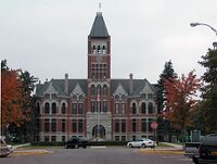 Completed in 1894, the Fillmore County Courthouse is a simplified version of the Richardsonian Romanesque style. The courthouse was designed by architect George E. McDonald and was modeled after the Gage County Courthouse in Beatrice. The two-story brick building, located in Geneva, has a prominent three-story tower with a community clock, installed by jeweler W. P. McCall in 1909.