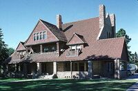 The George W. Frank House was constructed in an exclusive suburb of Kearney developed by the George W. Frank Improvement Company. Frank was involved in many of the town's industrial and commercial affairs. Built in 1889 of Colorado sandstone, the house represents the prosperity Kearney enjoyed during this period. It is a product of Eclecticism, combining the Shingle style and Richardsonian Romanesque architecture.