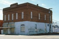 Built by owners James M. and Joshua Cox in Hampton, the two-story brick building housed retail businesses on the first level, with the opera house and lodge hall on the second floor. The stage has a wooden proscenium arch and a vintage curtain, depicting a nude with flower garlands, fringes, and tassels. The Holden Comedy Company gave the first performance in the opera house in December 1893.