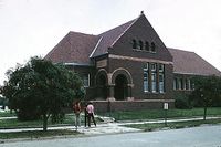 The Morton-James Public Library is a brick and stone structure erected in 1896-97 and designed in a simplified Richardsonian Romanesque style by the Omaha architectural firm of Fisher and Lawrie. Discussions concerning the establishment of a Public library in Nebraska City began as early as 1885 with John W. Steinhart as the main promoter. Joy Morton (see J. Sterling Morton House) provided financial assistance to construct the library, which celebrated its grand opening on April 10, 1897.