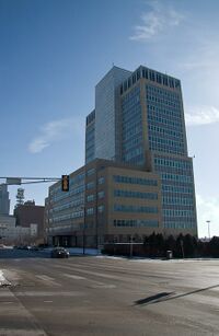 A leader in Omaha's growing service economy in the post-World War II period, the Northern Natural Gas Company tapped the Omaha architectural firm Latenser & Sons to construct this impressive modern office building in 1951. In 1958, a fifteen story addition was completed making the Northern Natural Gas building one of Omaha's tallest structures. With an emphasis on horizontal and vertical planes with tinted windows, this building embodies the modern corporate aesthetic of its period of construction.