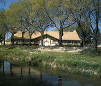 The Oak Ballroom is located on the banks of Lost Creek and is the focal point of Schuyler's city park. Designed by local architect Emiel Christensen, the ballroom incorporates architectural elements common to Period houses. The building has been an important entertainment and cultural center for the surrounding region. It was constructed as a relief project of the Works Progress Administration in 1935-37 and derives its name from the huge timbers and beams cut from native oak.