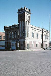The city council considered plans for a new city hall in July 1907. In December the plans of architect Joseph Guth were accepted, and C. F. Kaul was awarded the building contract. The building was completed in 1909 at a cost of $11,000. The two-story masonry building features a prominent clock/bell tower and houses a fire station on the first level and a council chamber on the second floor. The German nativity of the architect and the widespread use of this medieval town hall type in German and Italian cities suggest that Guth drew on this background to design the Schuyler City Hall.