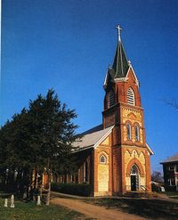 The St. Boniface Catholic Church, located in the town of Menominee, was established for the German-Catholic families who settled in the Antelope Creek valley in the late nineteenth century. The key buildings include the 1886 church and the 1923 school, both utilizing native chalk rock in their construction. Partially destroyed by fire in 1900, the church was rebuilt and dedicated in June 1902. Franz Zavadil, a native of Bohemia, was primarily responsible for the construction of the present building (see Franz Zavadil Farmstead). The church's highly decorative combination of chalk rock and brickwork demonstrates a medieval approach to church design. Zavadil incorporated design elements found in native Czech churches into St. Boniface Church. The property also includes a brick rectory, built in 1911, and the church cemetery.
