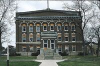 The Webster County Courthouse was built in 1914. The building, a vitrified brick edifice of three stories, is designed in the Second Renaissance Revival style. Trimmed in stone, with a stone foundation, the symmetrical rectangular building features central projecting pavilions at each of its two side ends and a front, south facade that projects slightly across its entire width from the main block of the building. A high parapet above the wall cornice slopes upward slightly toward the center of each facade. Willa Cather used the courthouse as the setting for the immigrant trials in her novel, One of Ours.