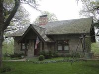 Constructed in 1936, the Gordon House is located in Bellevue. The one-and-one-half story house is designed in the Craftsman style. The house has gabled ends with large, triangular-braced, decorative supports positioned under wide eaves. The exterior is clad with multi-hued gray limestone veneer. The overall historical integrity enables this property to convey its significance as an excellent example of a Craftsman style house.