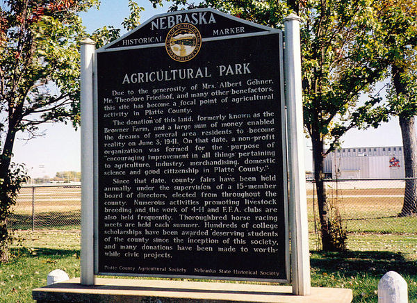 Due to the generosity of Mrs. Albert Gehner, Mr. Theodore Friedhof, and many other benefactors, this site has become a focal point of agricultural activity in Platte County. The donation of this land, formerly known as the Browner Farm, and a large sum of money enabled the dreams of several area residents to become reality on June 3, 1941. On that date, a non-profit organization was formed for the purpose of "encouraging improvement in all things pertaining to agriculture, industry, merchandising, domestic science and good citizenship in Platte County." Since that date, county fairs have been held annually under the supervision of a 15-member board of directors, elected from throughout the county. Numerous activities promoting livestock breeding and the work of 4-H and F.F.A. clubs are also held frequently. Thoroughbred horse racing meets are held each summer. Hundreds of college scholarships have been awarded deserving students of the county since the inception of this society, and many donations have been made to worth-while civic projects.