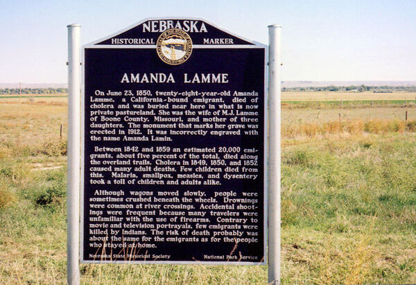 On June 23, 1850, twenty-eight-year-old Amanda Lamme, a California-bound emigrant, died of cholera and was buried near here in what is now private pastureland. She was the wife of M.J. Lamme of Boone County, Missouri, and mother of three daughters. The monument that marks her grave was erected in 1912. It was incorrectly engraved with the name Amanda Lamin. Between 1842 and 1859 an estimated 20,000 emigrants, about 5 percent of the total, died along the overland trails. Cholera in 1849, 1859, and 1852 caused many adult deaths. Few children died from this. Malaria, smallpox, measles, and dysentery took a toll of children and adults alike. Although wagons moved slowly, people were sometimes crushed beneath the wheels. Drownings were common at river crossings. Accidental shootings were frequent because many travelers were unfamiliar with the use of firearms. Contrary to movie and television portrayals, few emigrants were killed by Indians. The risk of death probably was about the same for the emigrants as for the people who stayed at home.
