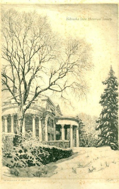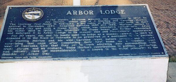 The stately, 52-room mansion was completed in 1903 by Joy Morton, oldest son of J. Sterling and Caroline Morton. The Mortons' first home in Nebraska, a log cabin at Bellevue, was built on their arrival in December 1854. Sometime between 1855 and 1858, Morton moved to Nebraska City and built a frame home, which was remodeled periodically. After his father died in 1902, Joy inherited the frame house and further remodeled and enlarged it as Arbor Lodge to its present size and Neo-colonial appearance. For 20 years, Joy and his family used the lodge as a summer retreat. In 1923 he donated it to the State of Nebraska to be preserved as a monument to his parents. J. Sterling Morton and his wife Caroline were nature lovers, and it isn't surprising that soon after completing their first home on a treeless tract west of Nebraska City that they set to work adorning their surroundings with trees, shrubs, and an orchard. While Morton's contributions to politics, journalism, and industry were not inconsiderable, he is known to the world primarily as the founder of Arbor Day.