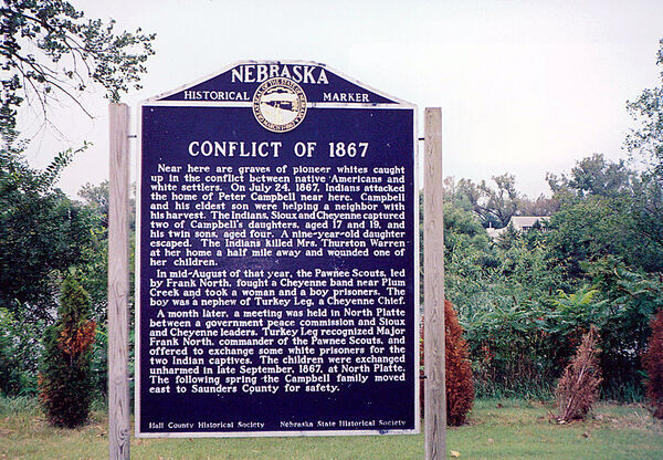 In mid-August of that year, the Pawnee Scouts, led by Frank North, fought a Cheyenne band near Plum Creek and took a woman and a boy prisoners. The boy was a nephew of Turkey Leg, a Cheyenne Chief. A month later, a meeting was held in North Platte between a government peace commission and Sioux and Cheyenne leaders. Turkey Leg recognized Major Frank North, commander of the Pawnee Scouts, and offered to exchange some white prisoners for the two Indian captives. The children were exchanged unharmed in late September, 1867, at North Platte. The following spring the Campbell family moved east to Saunders County for safety.