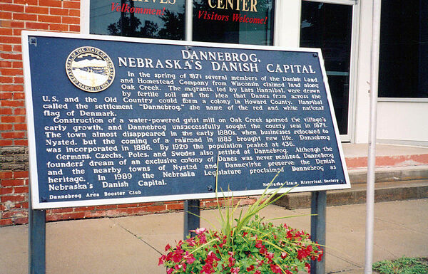 In the spring of 1871 several members of the Danish Land and Homestead Company from Wisconsin claimed land along Oak Creek. The migrants, led by Lars Hannibal, were drawn by fertile soil and the idea that Danes from across the U.S. and the Old Country could form a colony in Howard County. Hannibal called the settlement "Dannebrog," the name of the red and white national flag of Denmark. Construction of a water-powered grist mill on Oak Creek sparked the village's early growth, and Dannebrog unsuccessfully sought the county seat in 1874. The town almost disappeared in the early 1880s, when businesses relocated to Nysted, but the coming of a railroad in 1885 brought new life. Dannebrog was incorporated in 1886. By 1920 the population peaked at 436. Germans, Czechs, Poles, and Swedes also settled at Dannebrog. Although the founders' dream of an exclusive colony of Danes was never realized, Dannebrog and the nearby towns of Nysted and Dannevirke preserve the Danish heritage. In 1989 the Nebraska Legislature proclaimed Dannebrog as Nebraska's Danish Capital.