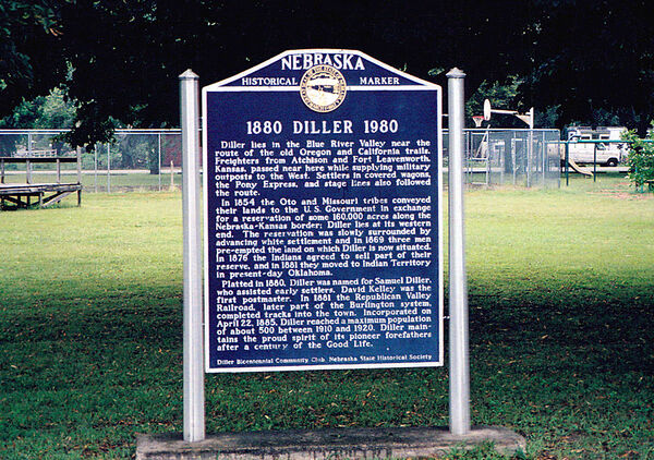 Diller lies in the Blue River Valley near the route of the old Oregon and California trails. Freighters from Atchison and Fort Leavenworth, Kansas, passed near here while supplying military outposts to the West. Settlers in covered wagons, the Pony Express, and stage lines also followed the route. In 1854 the Oto and Missouri tribes conveyed their lands to the U.S. Government in exchange for a reservation of some 160,000 acres along the Nebraska-Kansas border; diller lies at its western end. The reservation was slowly surrounded by advancing white settlement and in 1869 three men pre-empted the land on which Diller is now situated. In 1876 the Indians agreed to sell part of their reserve, and in 1881 they moved to Indian Territory in present-day Oklahoma. Platted in 1880, Diller was named for Samuel Diller, who assisted early settlers. David Kelley was the first postmaster. In 1881 the Republican Valley Railroad, later part of the Burlington system, completed tracks into the town. Incorporated on April 22, 1885, Diller reached a maximum population of about 500 between 1910 and 1920. Diller maintains the proud spirit of its pioneer forefathers after a century of the Good Life.