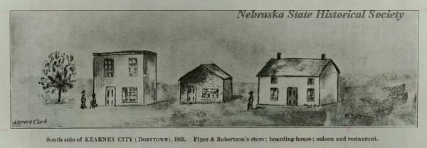 Following the 1848 establishment of Fort Kearny three miles east of here and the later expansion of overland commerce and emigration, the small commercial center of Kearney City was established near here in 1859. The town's more common name, Dobytown, was derived from the resemblance of its twelve to fifteen earthen buildings to adobe structures. Dobytown itself developed in response to the thousands of soldiers, freighters and travelers whose "needs" could not be met within the fort. Gambling, liquor and disreputable men and women were its principal attractions. One of the town's most famous visitors, General William Tecumseh Sherman described the horrible whiskey he was served here as "tanglefoot." However, in addition to its notorious functions, Dobytown also served as the major outfitting point west of the Missouri River, the center of frontier transportation from 1860 to 1866, a Pony Express station and the first county seat of Kearney County. The completion of the Union Pacific Railroad in 1869 reduced the flow of travel by the fort until finally in 1871 it was abandoned, souncing the death knell of Dobytown, a pioneer frontier town.
