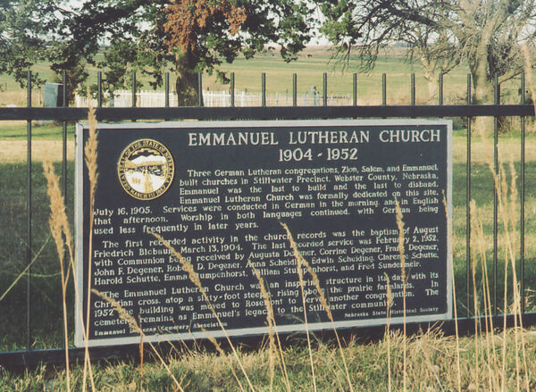 Three German Lutheran congregations, Zion, Salem, and Emmanuel, built churches in Stillwater Precinct, Webster County, Nebraska. Emmanuel was the last to build and the last to disband. Emmanuel Lutheran Church was formally dedicated on this site, July 16, 1905. Services were conducted in German in the morning, and in English that afternoon. Worship in both languages continued, with German being used less frequently in later years.