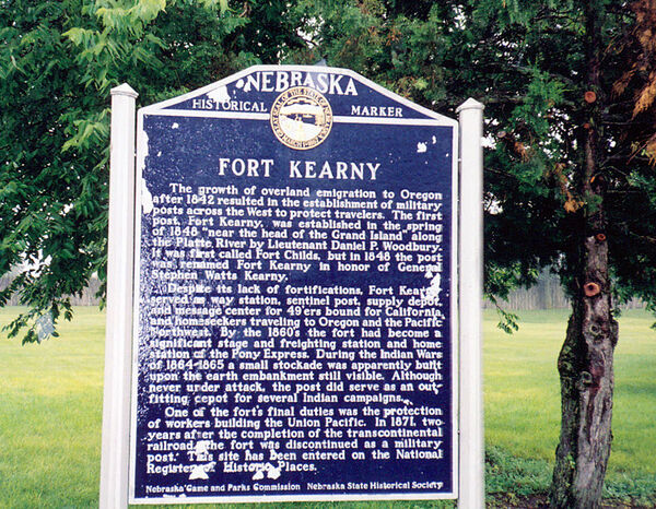 The growth of overland emigration to Oregon after 1842 resulted in the establishment of military posts across the West to protect travelers. The first post, Fort Kearny, was established in the spring of 1848 "near the head of the Grand Island" along the Platte River by Lieutenant Daniel P. Woodbury. It was first called Fort Childs, but in 1848 the post was renamed Fort Kearny in honor of General Stephen Watts Kearny. Despite its lack of fortifications, Fort Kearny served as way station, sentinel post, supply depot, and message center for 49'ers bound for California and homeseekers traveling to Oregon and the Pacific Northwest. By the 1860s the fort had become a significant state and freighting station and home station of the Pony Express. During the Indian Wars of 1864-1865 a small stockade was apparently built upon the earth embankment still visible. Although never under attack, the post did serve as an outfitting depot for several Indian campaigns. One of the fort's final duties was the protection of workers building the Union Pacific. In 1871, two years after the completion of the transcontinental railroad, the fort was discontinued as a military post. This site has been entered on the National Register of Historic Places.