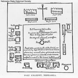 Two cities, Kearney City (Dobytown) and Valley City (Dogtown) developed in the vicinity of the fort. These started out as places for mail carriers to rest their horses and get food. Kearney City became famous for its plentiful bars and gamblers. These towns slowly disappeared after the railroad was built in 1866. The new town of Kearney, on the railroad line north of the Platte, became the municipal center of the area.
