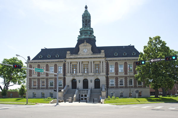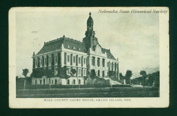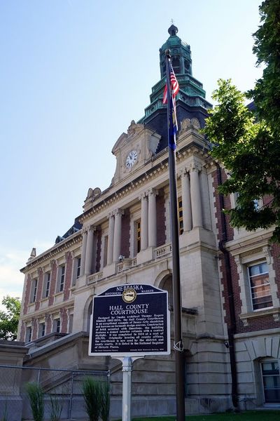 Designed by Omaha architect Thomas Rogers Kimball (1862-1934), the Hall County Courthouse is an exceptional example of Beaux-Arts classicism and borrows on Germanic design sources. Constructed of brick accented with limestone, the building features a domed interior rotunda with a central skylight. It was completed in 1904 at a cost of $131,793. Originally housing all county offices, the courthouse is now used by the district and county courts. It is listed in the National Register of Historic Places.