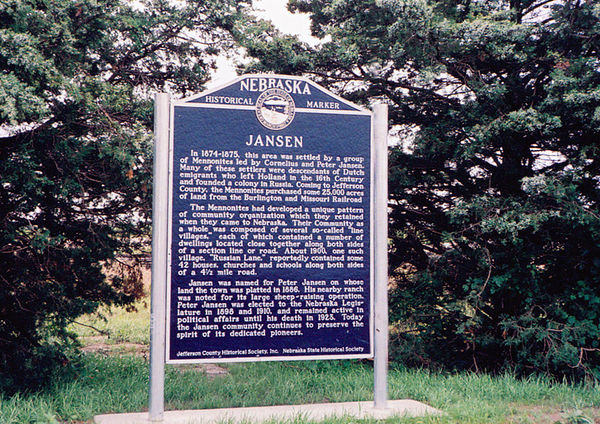 In 1874-1875, this area was settled by a group of Mennonites led by Cornelius and Peter Jansen. Many of these settlers were descendants of Dutch emigrants who left Holland in the 16th Century and founded a colony in Russia. Coming to Jefferson County, the Mennonites purchased some 25,000 acres of land from the Burlington and Missouri Railroad. The Mennonites had developed a unique pattern of community organization which they retained when they came to Nebraska. Their community as a whole was composed of several so-called "line villages," each of which contained a number of dwellings located close together along both sides of a section line or road. About 1900, one such village, "Russian Lane," reportedly contained some 42 houses, churches and schools along both sides of a 4 1/2 mile road. Jansen was named for Peter Jansen on whose land the town was platted in 1886. His nearby ranch was noted for its large sheep-raising operation. Peter Jansen was elected to the Nebraska Legislature in 1898 and 1910, and remained active in political affairs until his death in 1923. Today the Jansen community continues to preserve the spirit of its dedicated pioneers.