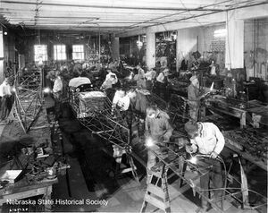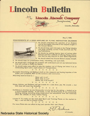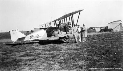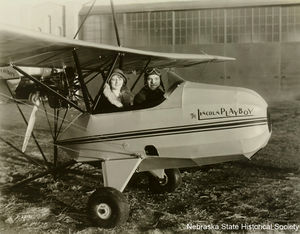 From the heroics of stunt fliers at pre-World War I state fairs through the experimentation of the 1920s, Lincoln held a unique position in aviation manufacturing and pilot training. After WWI, Ray Page and his wife Ethel purchased surplus Army planes and rebuilt them at their Lincoln Standard Aircraft Company, 2409 "O" Street. Some models manufactured were the Lincoln-Standard and Lincoln-Page (both 3-place), Lincoln-Page LS5 (5-place), and one model for assembling at home. Page's "Link-up-with-Lincoln" civic boosters, flying Standards, in 1925 carried greetings to Oklahoma, Texas, and California. Daredevil fliers of the Page Aerial Pageant advertised Lincoln across Mid-America. Johnny Moore's highly successful Arrow Sport was built at 27th and N and later at Havelock by Pace Woods. The Harding, Zook and Bahl Corporation produced the Lark Monoplane at 107 North 9th. During this period Lincoln for a time was third-ranked in America in plane manufacturing. Such an environment appealed to young Charles Lindbergh of Minnesota, destined to become aviation's preeminent figure. He learned flying fundamentals at Page's school, served a barnstorming apprenticeship, and was graduated from the Air Reserve Corps as a 2nd lieutenant. In 1927 following service as an airmail pilot, Lindbergh flew his "Spirit of St. Louis" from New York to Paris.